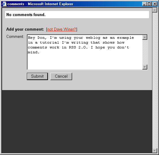 This document is a case study that shows how UserLand's weblog tool and aggregator both support comments. By illustrating this, I'm hoping that other tools and aggregators will also use this feature of RSS.